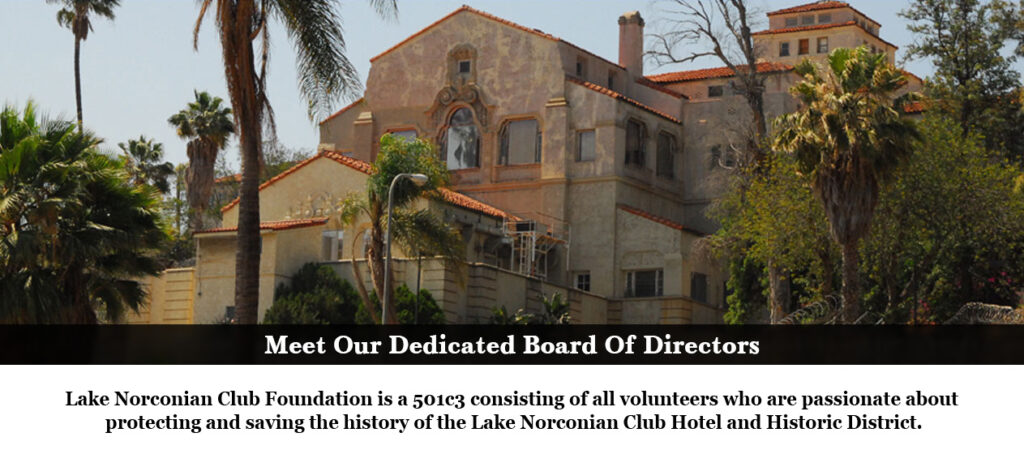 Diana has always been fascinated with the Lake Norconian Hotel and she is very proud to be a part of this organization. With the creation of this website she is hoping to inspire others to show their appreciation of this great treasure and encourages everyone to help with this great cause. The goal of this website is to provide the public with details on how everyone can help to save this great piece of history.